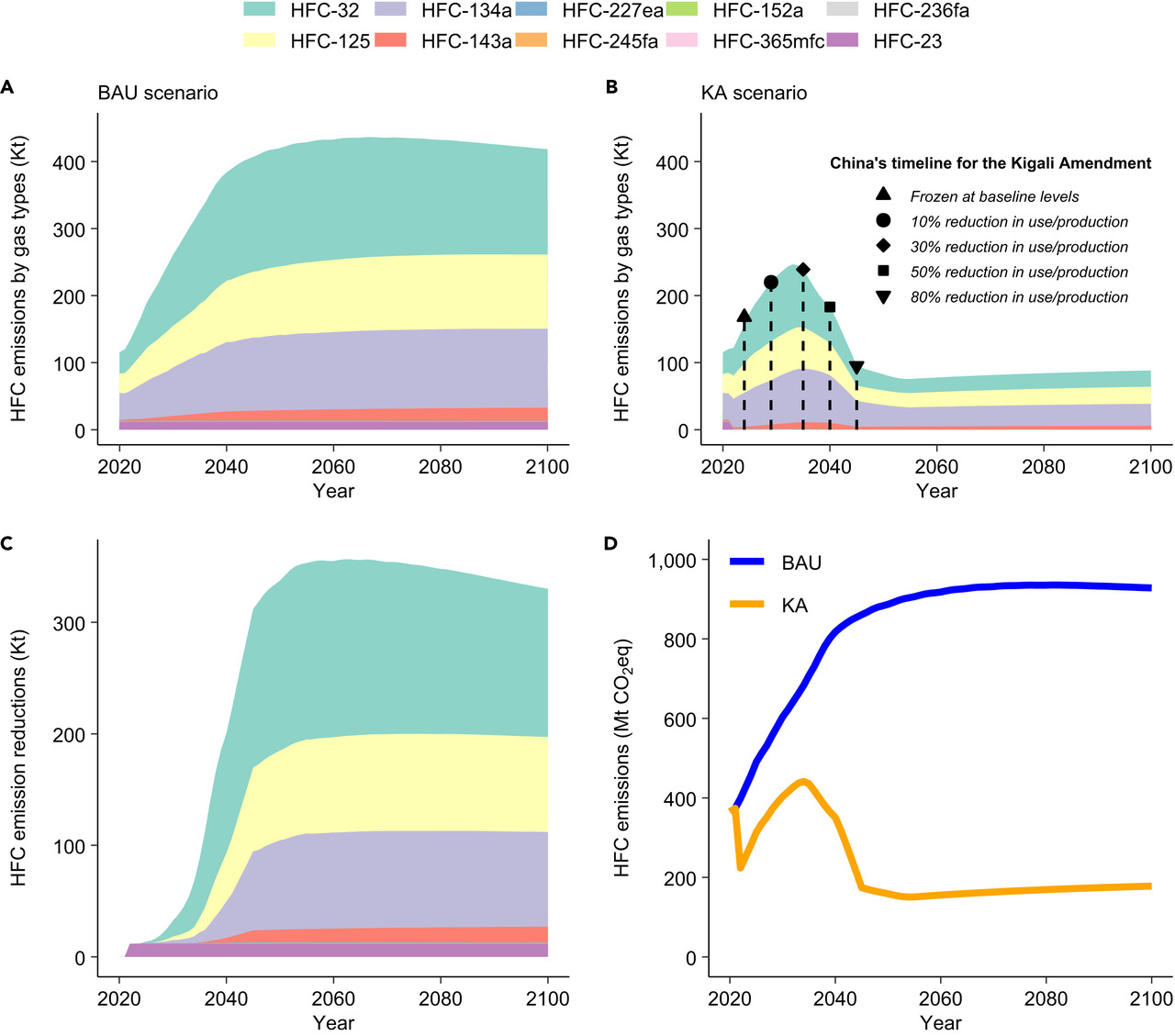 (B) HFC emissions in China under the KA scenario by 2100.