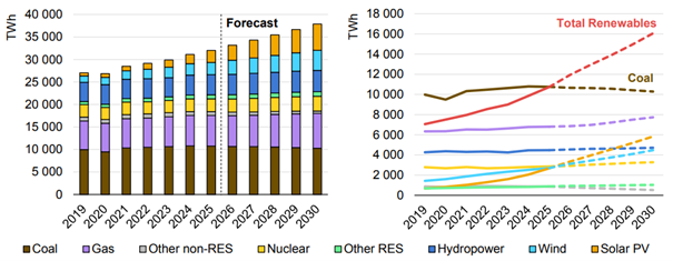 Despite this shift, coal is likely to remain the single largest source of electricity globally, even as its overall share gradually declines. Additional demand over the next five years is expected to be met entirely by renewables, natural gas and nuclear, helping power-sector carbon emissions decrease.