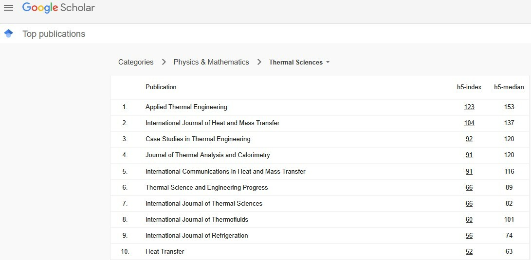 Similar to the previous year, the International Journal of Refrigeration ranks among the 10 most cited publications in the Thermal Sciences category, according to the 2025 Google Scholar Metrics ranking.