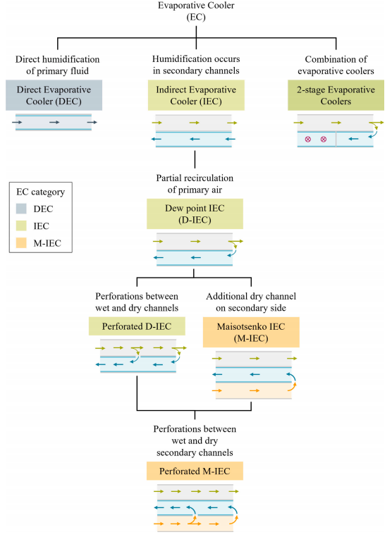 • Maisotsenko indirect evaporative coolers (M-IEC): These devices introduce an additional dry channel on the secondary side to further reduce the achievable cooling temperature and improve efficiency.