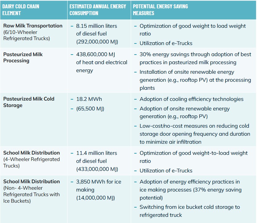 The study identifies opportunities to improve energy efficiency across Thailand’s dairy cold chain, with potential savings in transportation, processing, storage, and ice-making. For example, ice-making for non-refrigerated distribution could deliver 37 % energy savings, with further reductions possible by shifting to refrigerated vehicles.