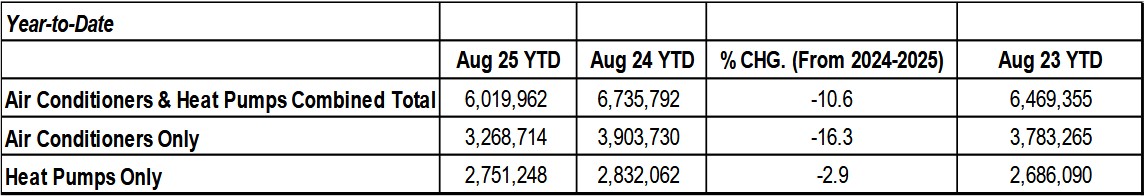 Year-to-date combined shipments of central air conditioners and air-source heat pumps are down 10.6 % over the number of units shipped in the same period in 2024. Year-to-date shipments of central air conditioners decreased by 16.3 %, while those of heat pumps decreased by 2.9%.