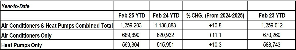 Year-to-date combined shipments of central air conditioners and air-source heat pumps are up 10.8% over the number of units shipped in the same period in 2024. Year-to-date shipments of central air conditioners increased by 11.1%, while those of heat pumps increased by 10.3%.