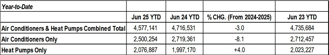 Year-to-date combined shipments of central air conditioners and air-source heat pumps are down 3.0% over the number of units shipped in the same period in 2024. Year-to-date shipments of central air conditioners decreased by 8.1%, while those of heat pumps increased by 4.0%.