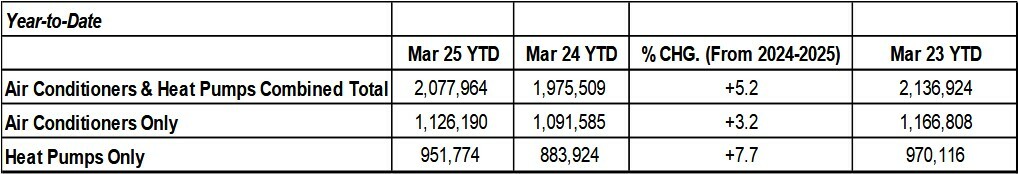 The Air-Conditioning, Heating and Refrigeration Institute (AHRI) provides monthly data on the volume of heating and cooling equipment shipped by US manufacturers into the US market. Their latest shipment data report covered the month of March 2025, with year-to-date comparisons with March 2024.