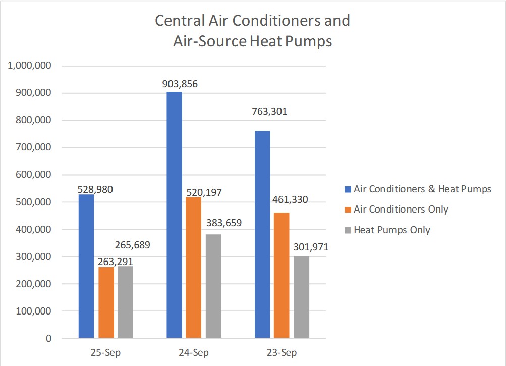 According to AHRI, US shipments of central air conditioners and air-source heat pumps totalled 528,980 units in September 2025, down – 41.5 % from the 903,856 units shipped in September 2024.