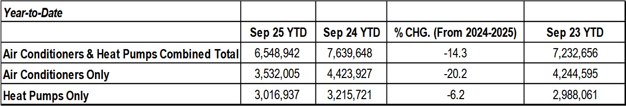 Year-to-date combined shipments of central air conditioners and air-source heat pumps are down 14.3 % over the number of units shipped in the same period in 2024. Year-to-date shipments of central air conditioners decreased by 20.2 %, while those of heat pumps decreased by 6.2 %.