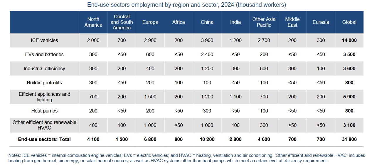 IEA categorises as “end-use efficiency” the sectors of energy efficiency in buildings – covering retrofits, heating, ventilation and air conditioning equipment, as well as appliances – and of the efficiency of electric motors in industry. In 2023, IEA had estimated that end use efficiency, including HVAC in buildings, employed 9.8 million workers worldwide [2]. In the World Energy Employment 2025 report, the scope of the workforce is more detailed in end-use sectors, now distinguishing subsectors such as heat pumps (see table 1). China leads the heat pumps labour market with 300,000 workers, followed by Europe and North America each with an estimated 200,000 workers [1].