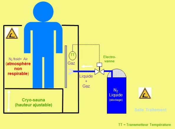 - Les cryosaunas, utilisés pour la cryothérapie dite « à corps partiel », fonctionnent par injection directe d’azote liquide dans un caisson ouvert au niveau de la tête. Cette technologie présente un risque connu d’anoxie (manque d’oxygène) en cas de mauvaise évacuation du gaz. C’est cette technologie qui était utilisée dans le centre parisien.