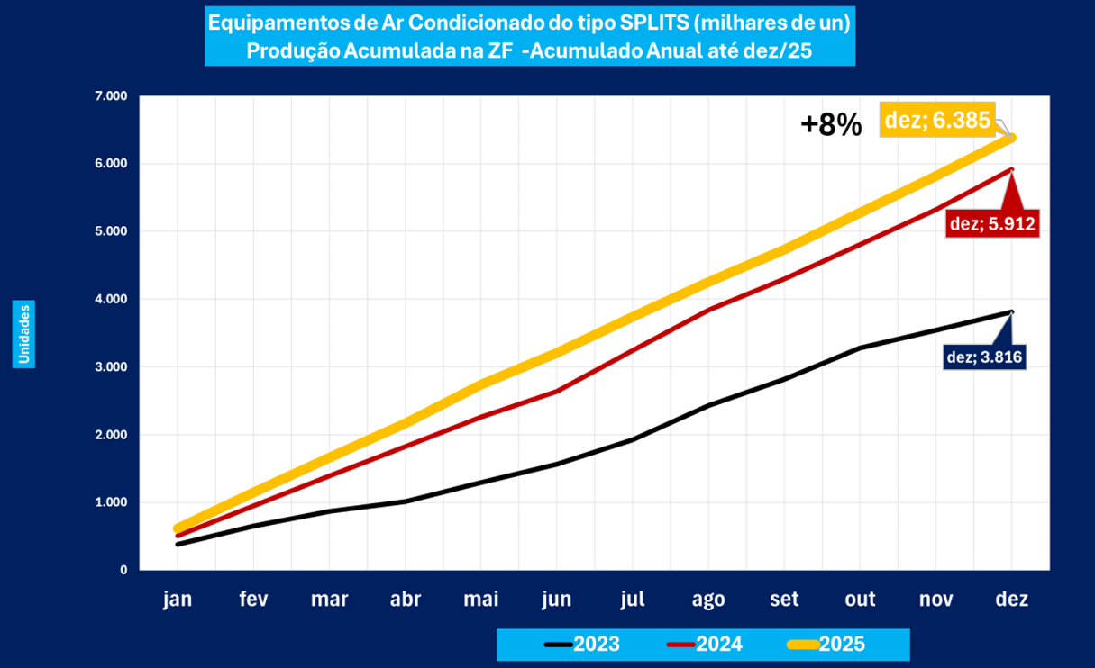 The Brazilian air-conditioning market maintained its upward trajectory in 2025, particularly in the residential segment. Production of split air-conditioning units is expected to exceed 6 million units for the year (data for December 2025 were not yet available at the time of the report release), marking an increase of around 8% compared to 2024.