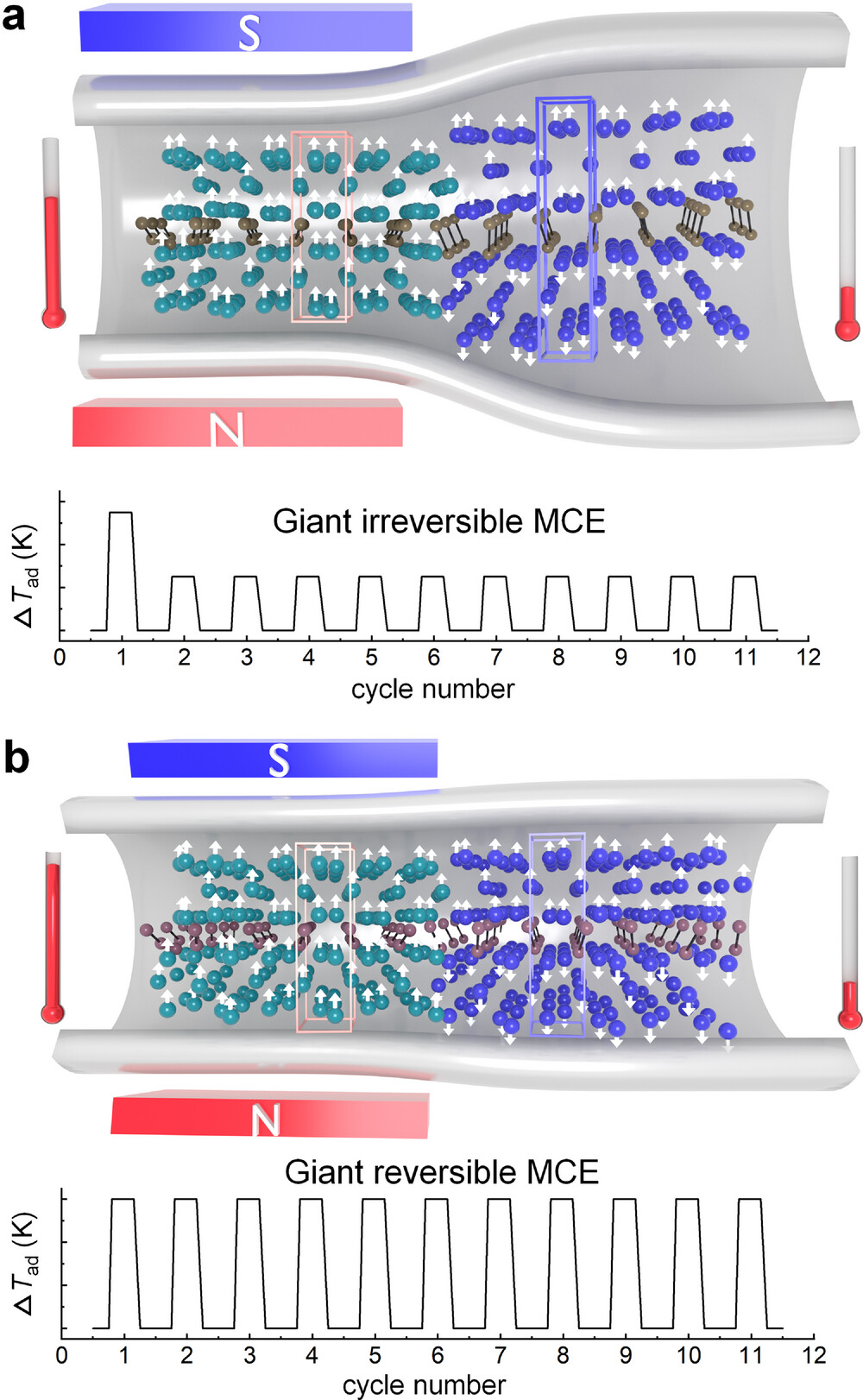Different strategies to achieve a giant reversible magnetocaloric effect (MCE) [1]: a) limitation of first-order magnetic phase transition, but with limitations to MCE in repeated cycles due to hysteresis; b) covalent bond engineering, allowing repeated high MCE thanks to modification of covalent bonds within a unit cell.