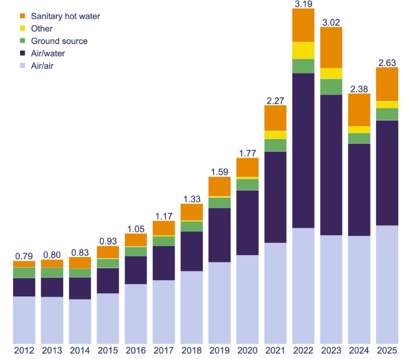 Preliminary figures from the European Heat Pump Association (EHPA) [1] show that heat pump sales grew by 11% in 2025 across 16 European countries (Austria, Belgium, Czech Republic, Denmark, Finland, France, Germany, Italy, Netherlands, Norway, Poland, Portugal, Spain, Sweden, Switzerland, UK). Around 2.63 million residential heat pumps were sold during the year, up from 2.38 million in 2024, bringing the total number installed in Europe to around 28 million units.