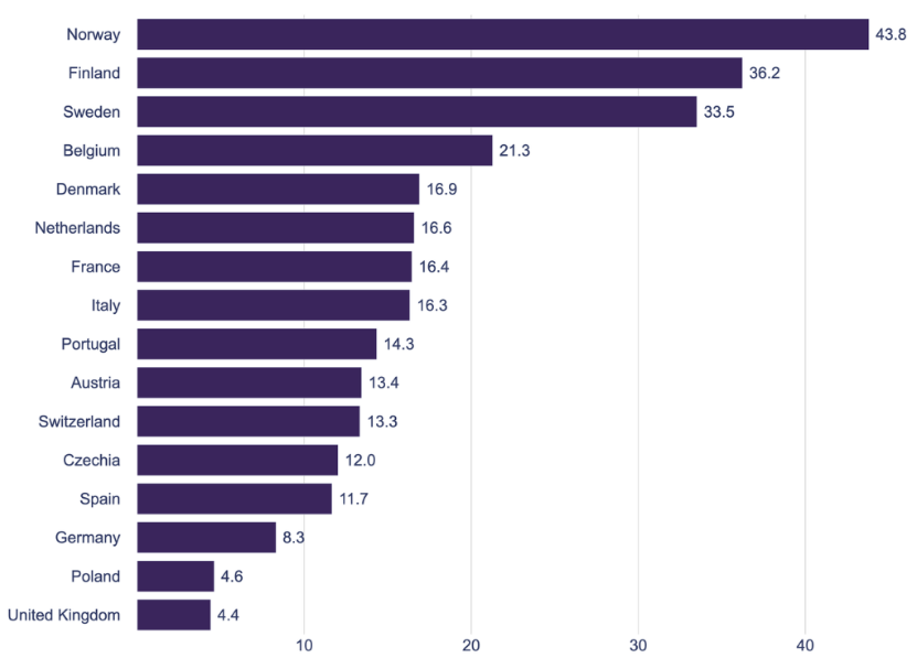 Despite overall growth, the heat pump market remains uneven across Europe. In terms of installations per household, the leading markets are Norway, Finland and Sweden, each with more than 30 heat pumps sold per 1,000 households.